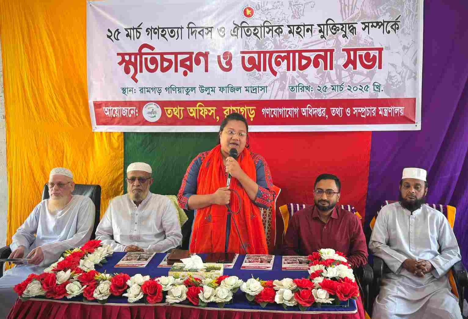 নিউজ ডেস্ক:রামগড় তথ্য অফিস আয়োজনে রামগড় গণিয়াতুল উলুম ফাজিল মাদ্রাসা মিলনায়তনে ২৫ মার্চ গণহত্যা দিবস ও ঐতিহাসিক মহান মুক্তিযুদ্ধ সম্পর্কে স্মৃতিচারণ ও আলোচনা সভা অনুষ্ঠিত হয়। মঙ্গলবার ২৫ মার্চ সকাল ১২টায় সহকারী তথ্য অফিসার খন্দকার তৌহিদের সভাপতিত্বে প্রধান অতিথি হিসেবে উপস্হিত ছিলেন রামগড় উপজেলা নির্বাহী অফিসার ও পৌর প্রশাসক মমতা আফরিন। বিশেষ অতিথি ছিলেন রামগড় গণিয়াতুল উলুম সিনিয়র ফাজিল মাদ্রাসার অধ্যক্ষ মুহাম্মদ ফখরুল ইসলাম,উপজেলা আইসিটি কর্মকর্তা রেহান উদ্দিন।